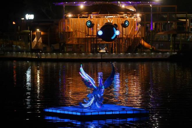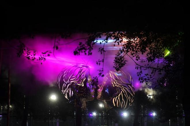 夜幕降临亮马河岸,灯火通明,贝壳剧场幻化为闪耀水岛,台面与河面交织成一片朦胧光幕。杨丽萍领衔的团队演绎《凤鸣·朝阳》。艺术节启动仪式中,2025北京朝阳国际灯光节会歌《这是我们的光》首度亮相。湖心处腾起十米高的光之鲲鹏,LED巨幅骏马群伴随其后,逐浪飞驰。表演者踩着亮光飞越160米湖面,在贝壳剧场的水域中心与鲲鹏同舞……这是北京首个跨水域的空中光景演出"飞跃蓝湖"展示的画面,也是今年灯光消费季策划的众多"光影+"艺术活动中的一个。