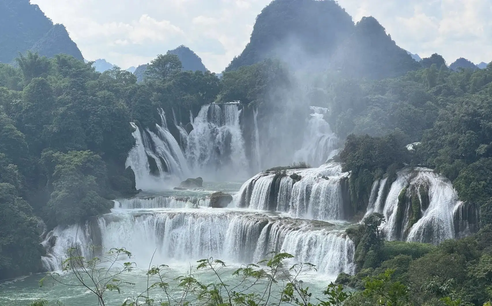 德天跨国瀑布景区地处广西崇左市境内,根据景区公布信息,德天大瀑布连接着两个国家,其宽度达到120米,落差约为70米,由三个层级逐级坠落,构成了别致的景致,它是亚洲规模最大的、全球排名第四的跨国瀑布,每年的水量大约是贵州黄果树瀑布的三倍还多,德天大瀑布的水质以纯净闻名,其水色常年呈现青绿色,从远处看去,瀑布仿佛是一条白色的绸缎,悬挂在两个国家的交界线上。