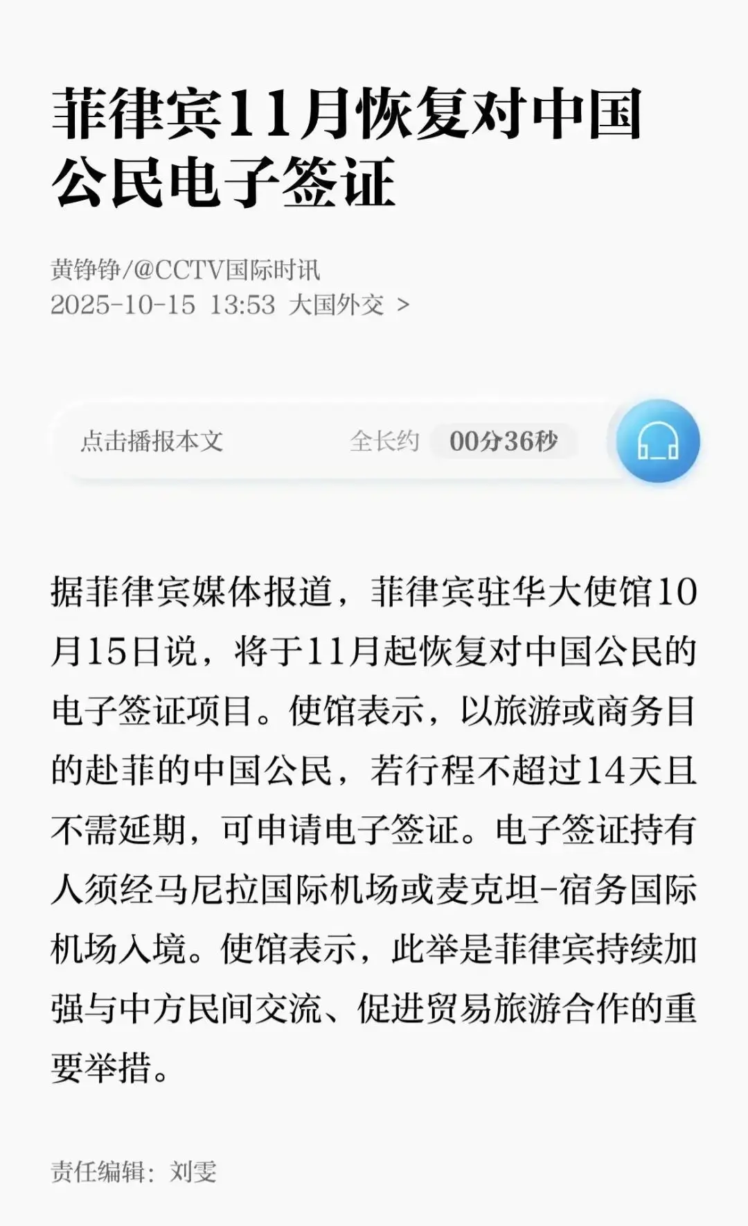菲律宾驻华大使馆宣布!2025 年 11 月将为中国公民推出电子签证?