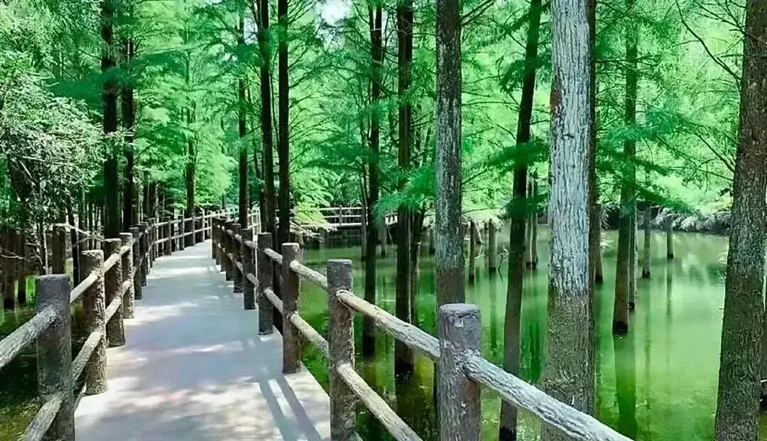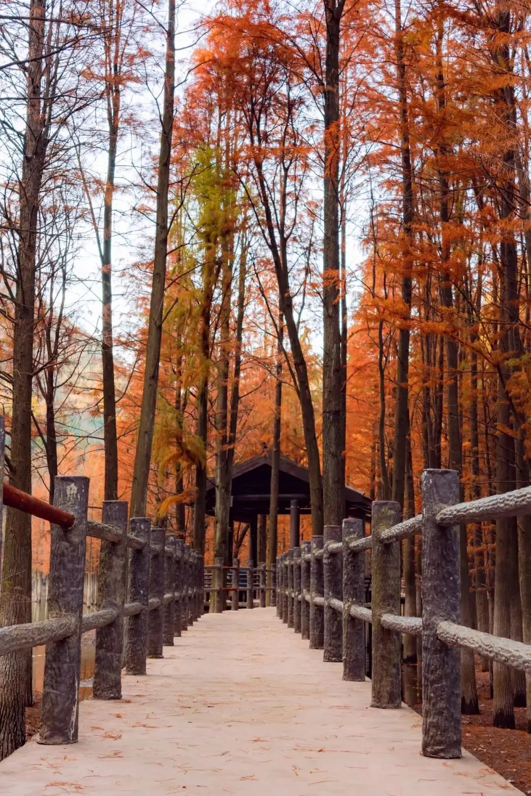 秋冬季来临时,那片火红的水杉林愈发壮观。金叶和褐干相互映衬,安静地耸立在水色清冽处,景致幽深迷人。这林子因四季风光各异,已成为社交平台备受追捧的浪漫景点。
