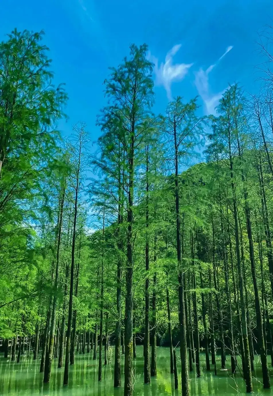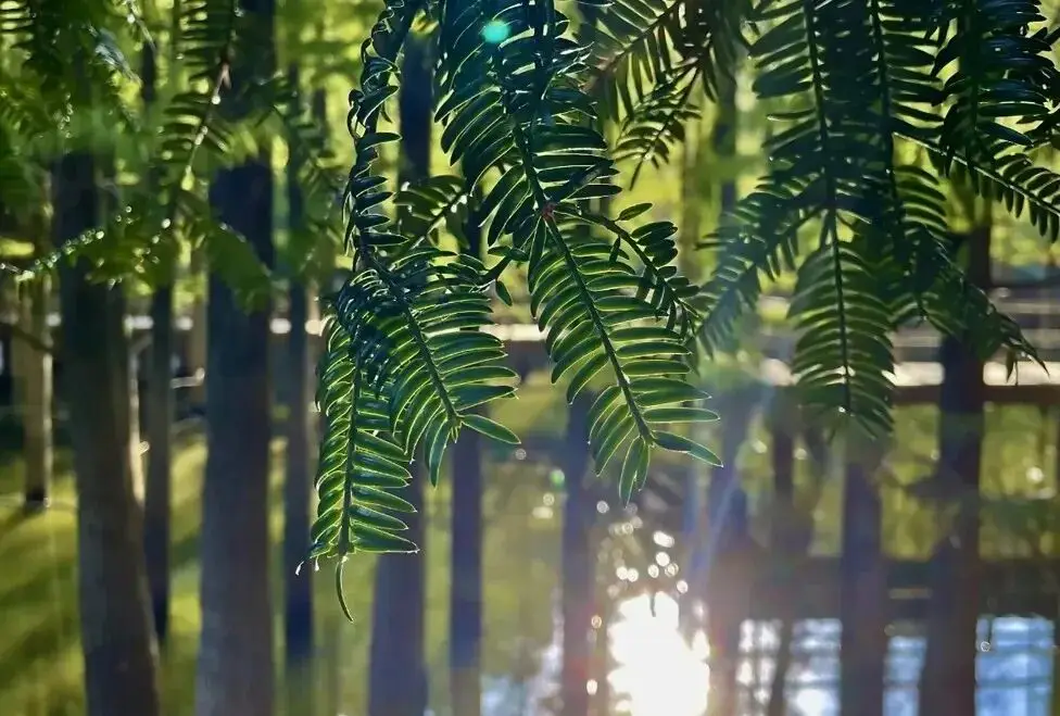 现在,水杉正经历着最迷人的转变期,树身下半部分依旧深绿,上半部分开始慢慢转黄,直立的主干深深扎根于清澈的水体中,枝叶间洒下的阳光在水面上形成闪烁的光点,青与黄交织的色彩,仿佛是自然有意放慢了色彩变化的步伐。