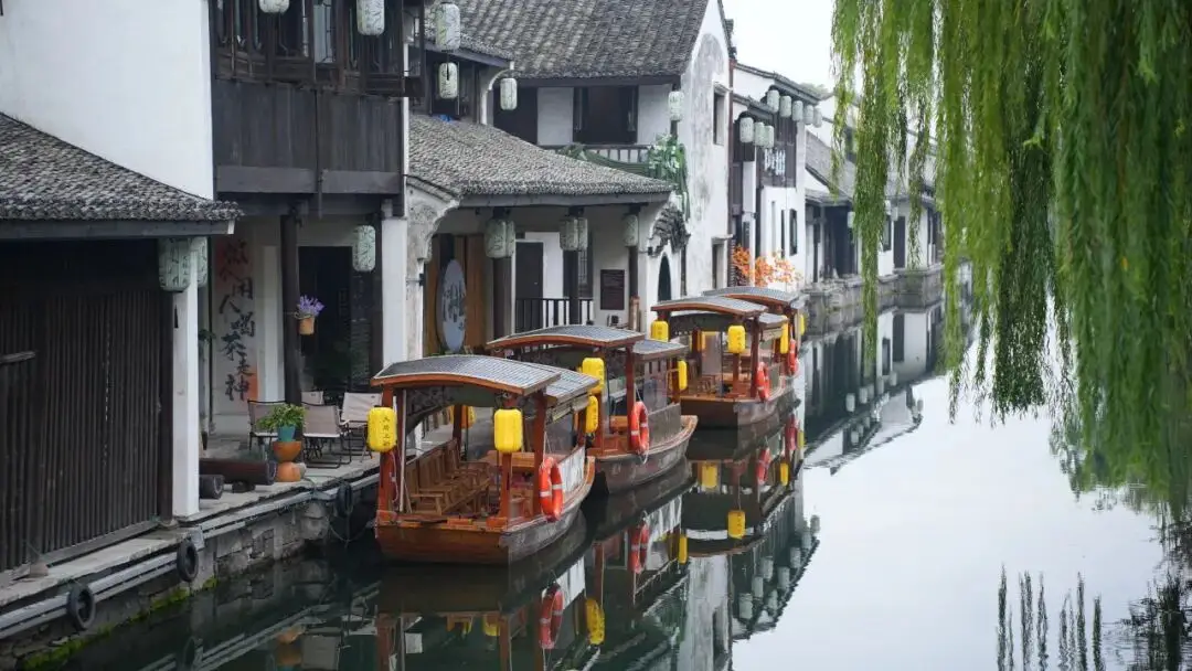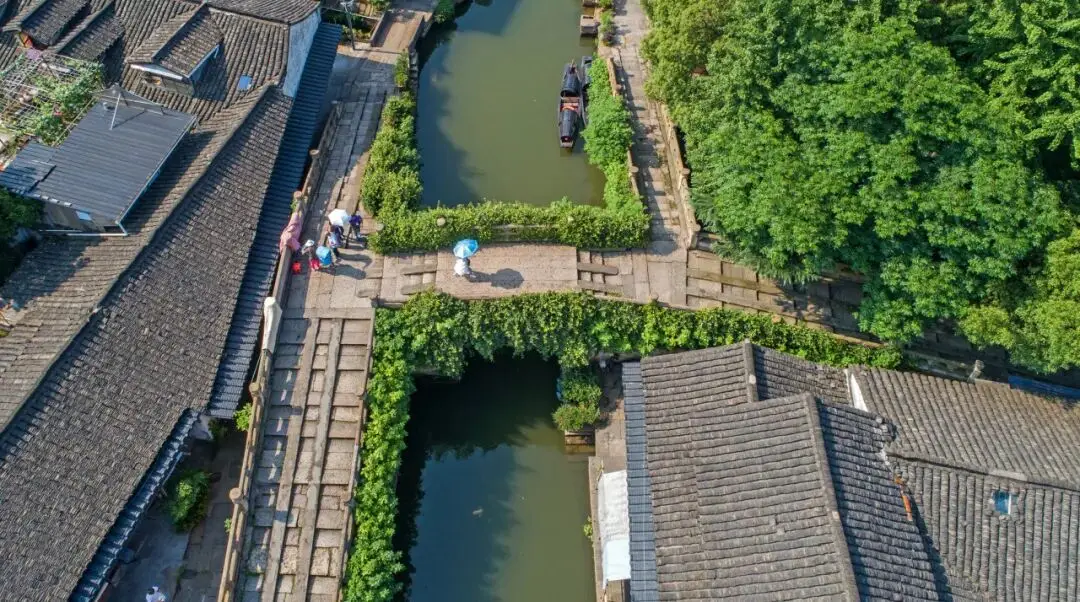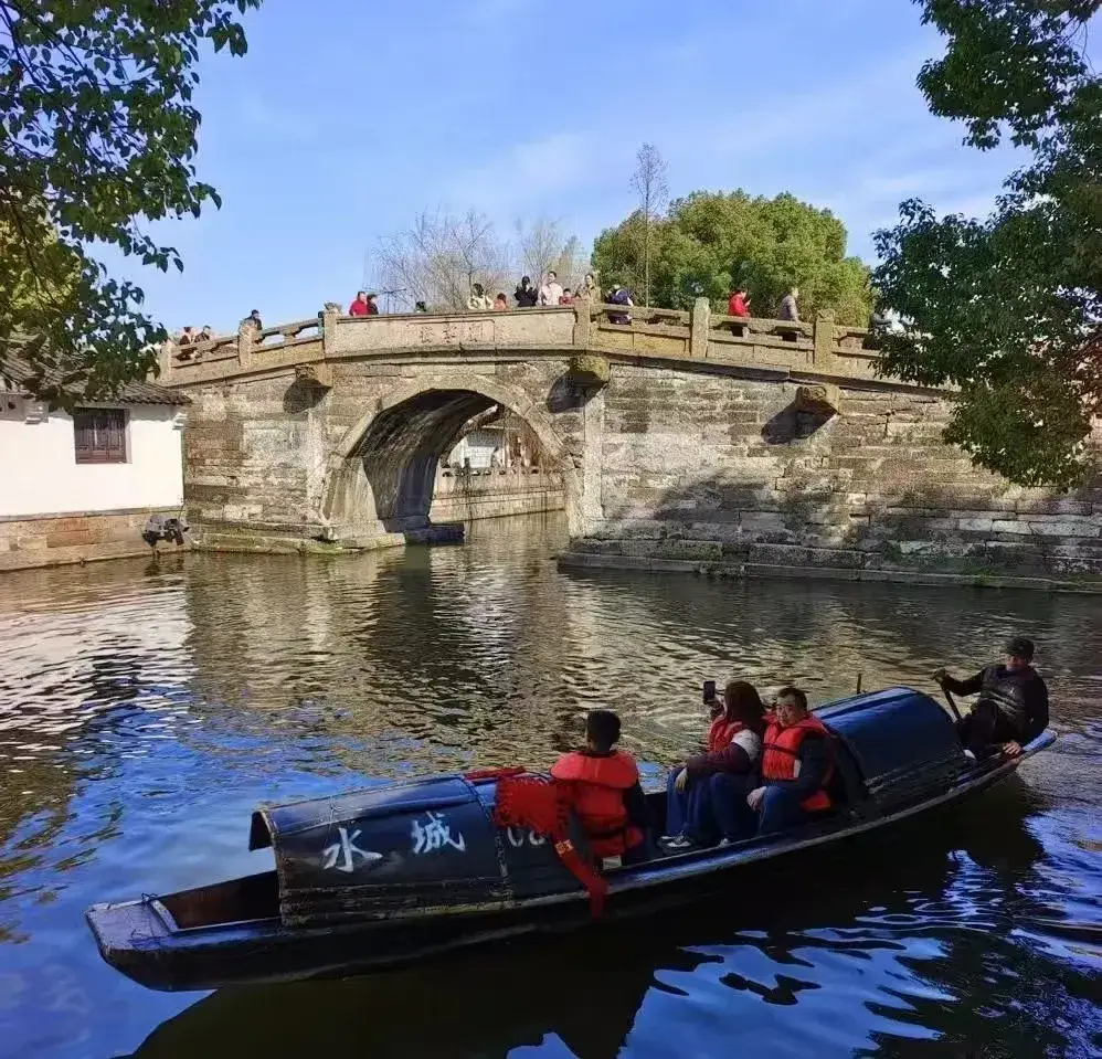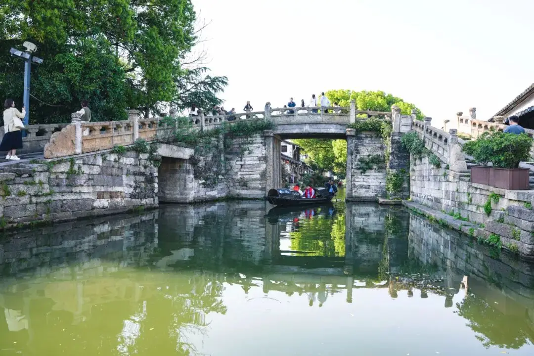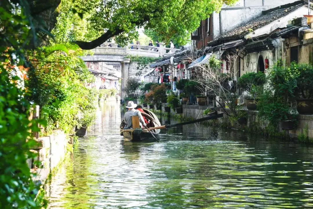 河岸边环山河水声清脆,乌篷船紧挨着岸边慢慢移动,船夫摇橹发出“咿呀”的声音,和南宋《梦粱录》里“船只拍打水面,声响清亮”的描述遥相呼应。