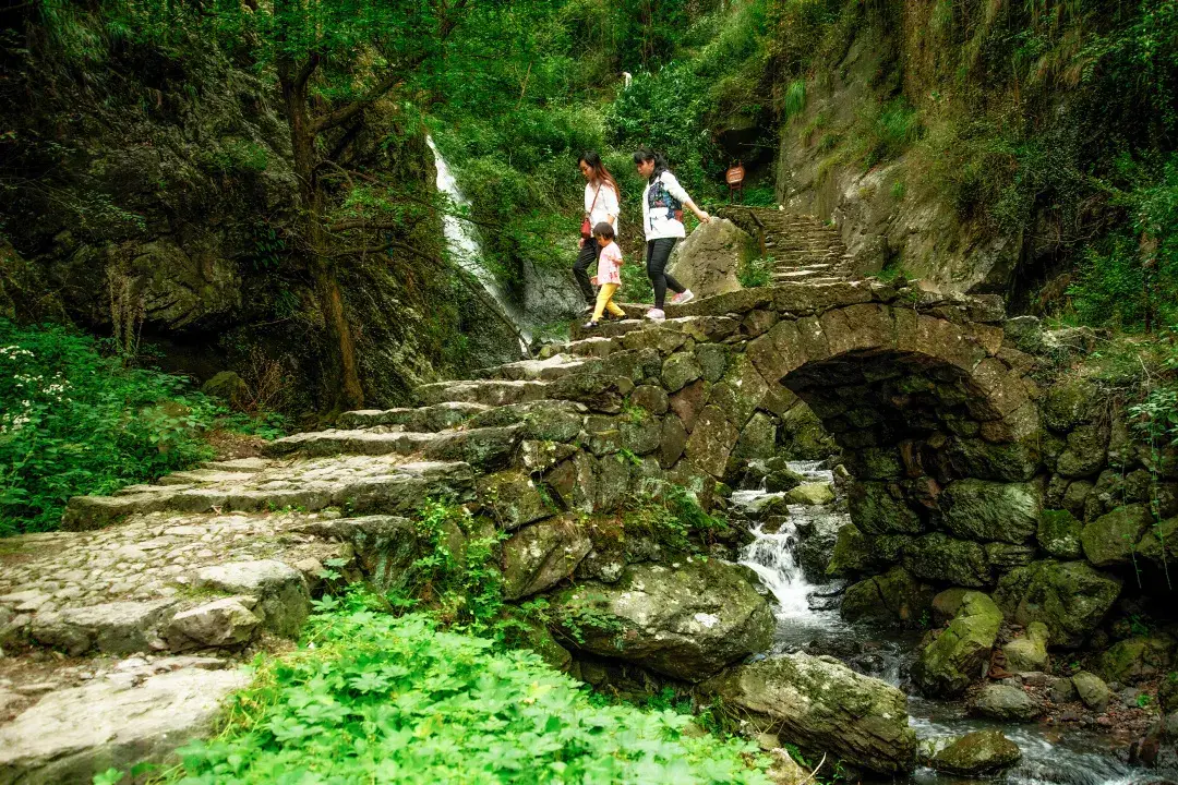 这条雪窦岭古道如今总长约三千米,溪边铺设的石头台阶保存得十分完整,道路两侧有高达百米的陡峭悬崖,还有瀑布与泉水不断流淌,以及各种奇形怪状的石头聚集在一起,因此也被人们称为“江南小九寨”。