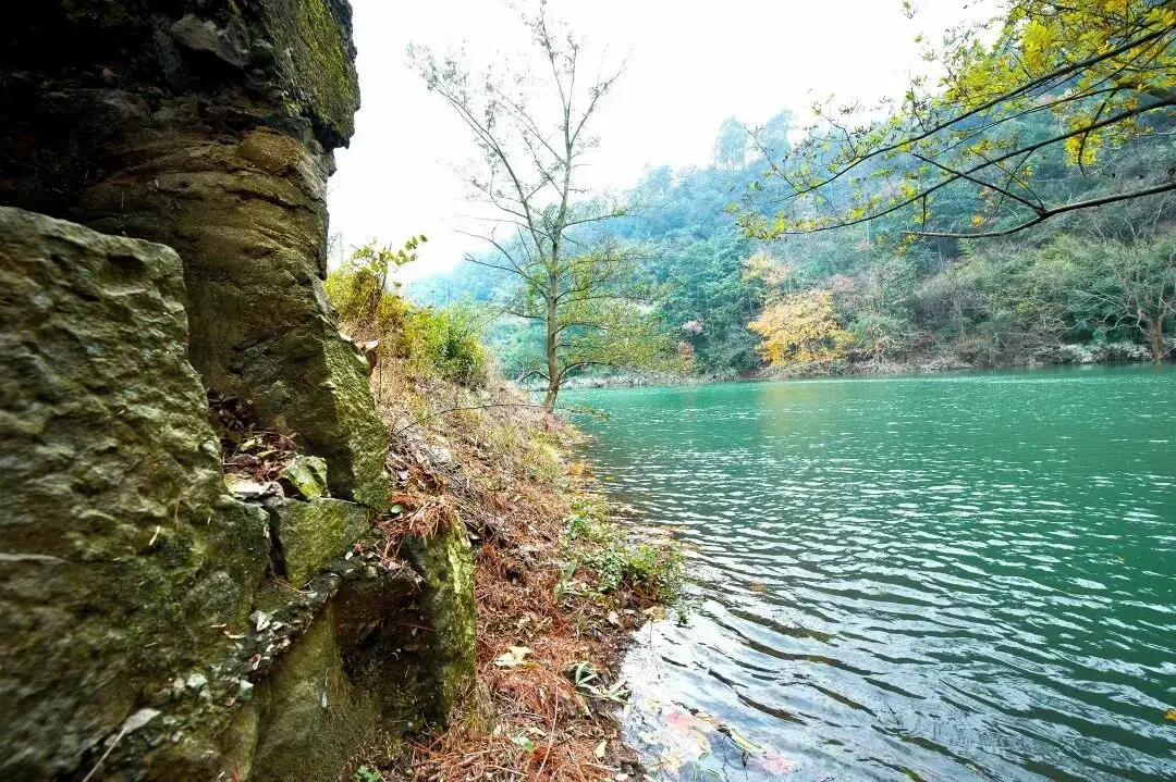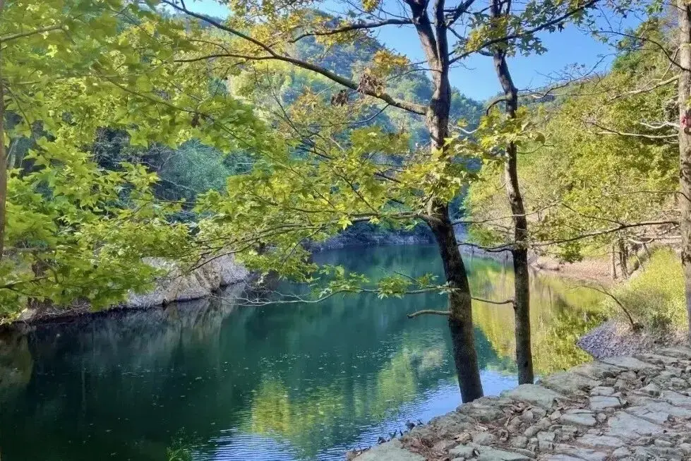 沿途穿过古道,前方就能望见山巅的水库,路旁的树木高低参差,相互掩映,阳光难以直射,核心位置是片翠绿如玉的水域。抵达水坝顶部,立刻感受到扑面而来的清冽微风,令人心境顿时开阔。