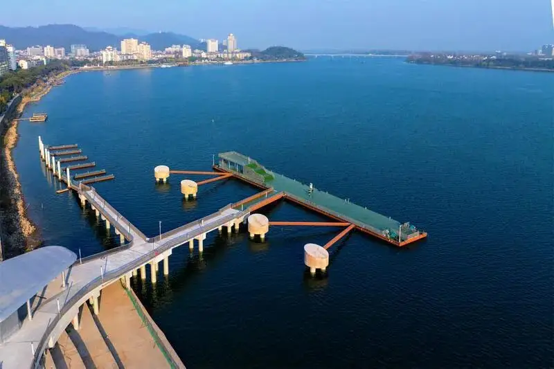 该码头属于高桩式结构,与亲水平台合为一体,设有两个旅客停泊点,码头主体长45米,占用的岸边区域宽65米,两侧还有约50米的连接部分,整体工程全长170.1米,现在正加紧实施。