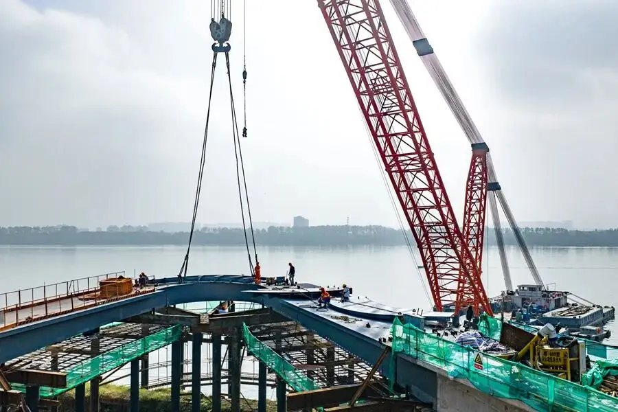 这座观景桥采用混凝土与钢材相结合的建造方式,桥面两侧的笔直路段宽度为5米,而圆弧形区域则超过8米宽,以大约45度的角度横跨在江面上,向外延伸约45米。桥体靠近地面的部分由混凝土构成,而悬空的外侧部分则使用钢结构。该桥梁的钢箱梁总共有6片,其中分量最重的那片超过了70吨。