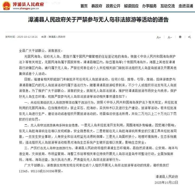 十月十二日,南碇岛由漳浦县管理,该县在相关信息披露之后,公布了一项《关于禁止参与无人岛屿非法旅行等行为的公告》,其中清楚表明,不允许任何未获许可的登岛行为。