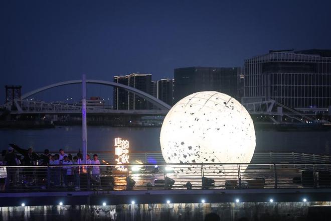 《月满》这件大型艺术作品,坐落在西岸梦中心船坞的亲水地带,由上海当代艺术博物馆(PSA)发起的“月来月美”城市艺术计划创作而成,该计划是博物馆主导的城市艺术活动,作品照片由海沙尔拍摄
