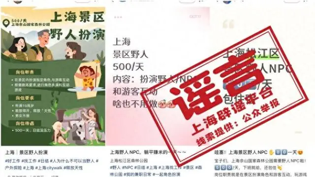 上海辟谣平台展开调查,发现佘山国家森林公园发布这一消息,原因是社交平台出现不少帖子,帖子称公园正在招人演野人,这类帖子还表明入职要求不高,只要熟悉公园,能与游客互动就行,且“日薪日结”,然而进一步核查发现,这类招聘信息都源自个人账号,对方无法给出招聘依据。