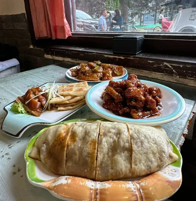 除了面食,此地的烤鸭店也许不像全聚德那样名声远播,倒是有可能具备更亲民的价位以及更接地气的风味。其外皮呈现出酥脆的状态,鸭肉质地细嫩,把它们用荷叶饼卷起来,涂抹上甜面酱,放置葱丝、黄瓜条,咬上一口,丰腴的鸭油香气在口腔里进发出来,是满满当当的满足感。