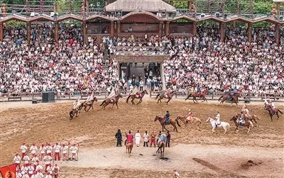 游客在万岁山武侠城观看实景演出《三打祝家庄》。 景区供图