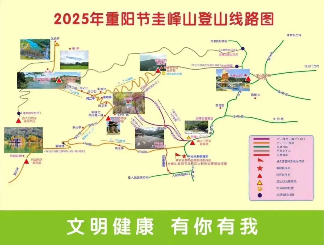 重阳节期间,设永镇山门站进行线下现场购票,设环山路站进行线下现场购票,设石涧公园站进行线下现场购票,设叱石坪站进行线下现场购票;封闭龙泉生态径,封闭大光明径。