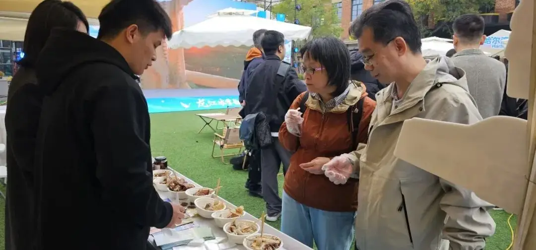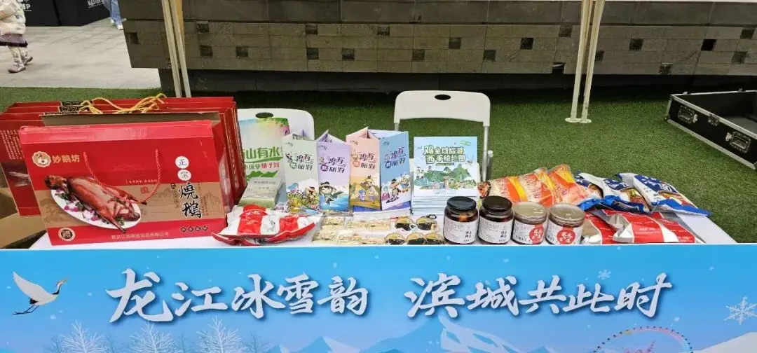 更为人气爆棚的“密山城子河双展区”,成为了鸡西物产与文创立体方面的展示窗口,在城子河展区当中,窖缸独头糖蒜以及窖缸酸菜散发着经过时光酝酿出来的醇厚香气,鸡西油辣椒的鲜辣跟冷面、刀削面的劲道形成了鲜明的呼应,妙鹅坊正宗烧鹅凭借诱人的色泽勾起了味蕾的期待,搭配上设计精巧的城子河区冰箱贴,使得市井风味与文创巧思实现了完美的融合。密山展区展现出多元底蕴,“密山好礼”中的紫砂餐具,和山珍特产礼盒,传递着北国给予的厚重,烤湖虾、香煎白鱼等湖鲜美食,呼应着兴凯湖“贡品”大白鱼的长久盛名;功臣号坦克合金模型、兴凯湖大白鱼雕塑摆台,承载着城市记忆,非遗剪纸灯的光影,与城市双展区的IP“飞飞”、“大白”系列文创的趣味碰撞,尽显传统与现代相融合的美妙;市民和游客,纷纷与文创展品、风光元素合影,定格北国风情的瞬间。