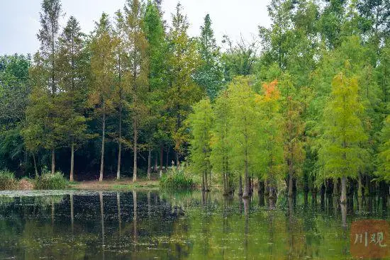 深秋时节成都市区彩林上线,白鹭湾水杉林成亮丽风景