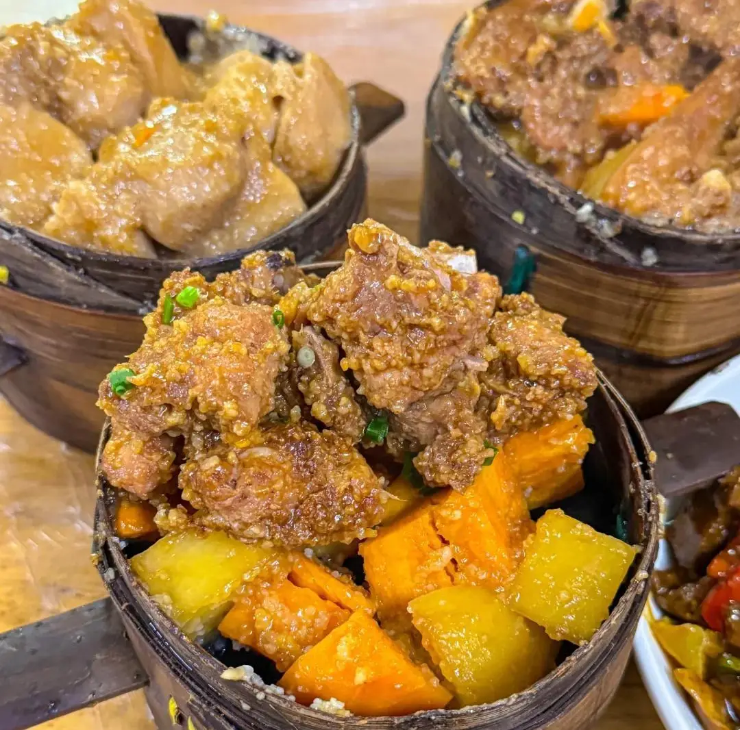 选作蒸牛肉的是牛肋条肉,将其切成薄片后,用酱油以及料酒进行腌制,之后蒸制呈现出软嫩且并非柴硬的状态,入口品尝有着满满的家常咸香味道,完全不存在塞牙情况;用作蒸丸子的为猪肉馅,其中添加了少许马蹄碎,咬开之时能够品尝到马蹄的脆爽之感,并且裹带着鲜美的肉汁,在咸鲜味方面恰到好处;蒸南瓜保留了自身的清甜口味,蒸制得粉糯,充分吸收了肉汁的油香,起到解腻同时下饭的作用。这三种食材放置于同一个蒸笼内进行蒸制,在揭开盖子的那一刹那,肉香与菜香混合在一起,仅仅闻着便让人不禁流口水。
