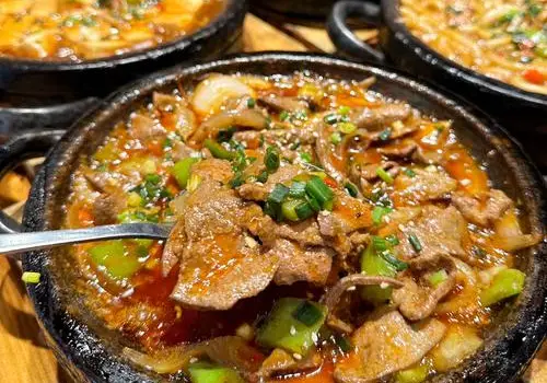 就讲下最常有的石锅豆腐哈:把嫩豆腐切成小块儿,拿肉末以及豆瓣酱去炒出汤汁来,接着倒入热石锅之中,豆腐将汤汁全部吸满,咬上一口软嫩且多汁,烫嘴但却舍不得停下;还有那石锅鱼,用的是来自洞庭湖的草鱼哩,鱼肉被煮得很嫩,汤汁十分鲜,石锅的热度使得鱼始终保持滚烫状态,吃到最后一口依旧是热乎的,冬天吃着格外暖身 。