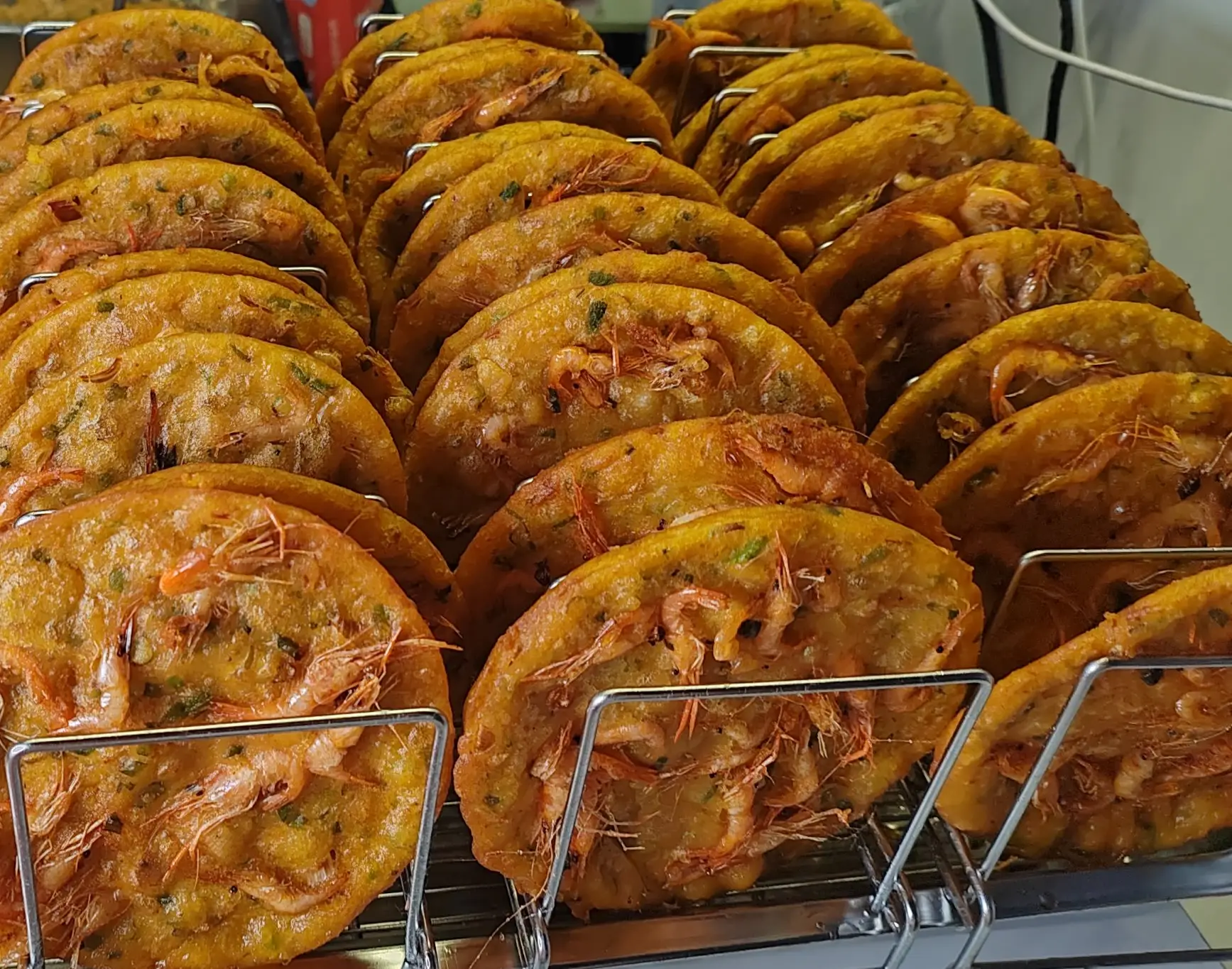 岳阳君山岛的特色是有君山虾饼,其所用是洞庭湖的小鲜虾而不是冻虾且极新鲜,做法是先把鲜虾剁成虾泥,接着将虾泥和面粉以及少许葱花拌均匀,随后捏成小小的圆饼,再放入油锅里炸至呈现出金黄状态,之后捞出去控干油,其外皮相当脆甚至会掉渣 。