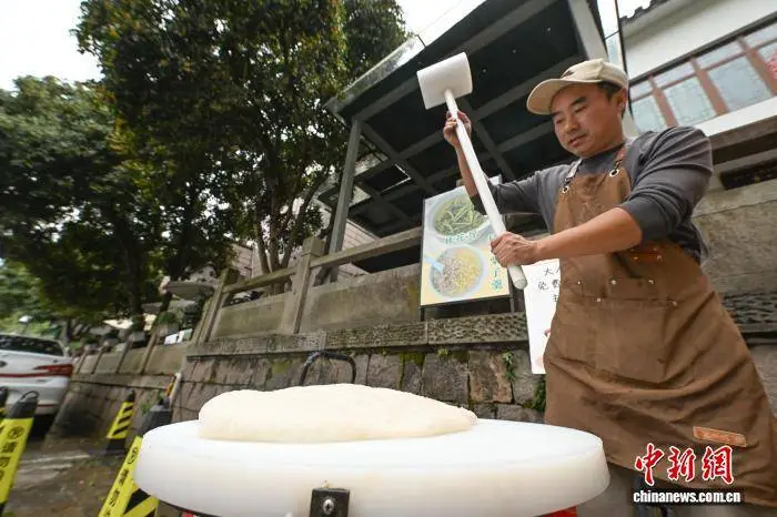 10月31日,商家于满觉陇村制作相关桂花糕,近日期间,浙江杭州西湖满觉陇村等地的桂花相继开放,作为西湖十景之一的“满陇桂雨”迎来了最佳的观赏时期,吸引了不少的游人前来赏秋打卡,中新社记者 王刚 摄