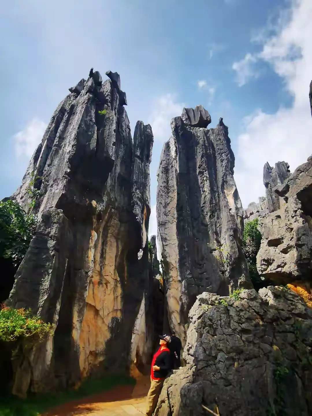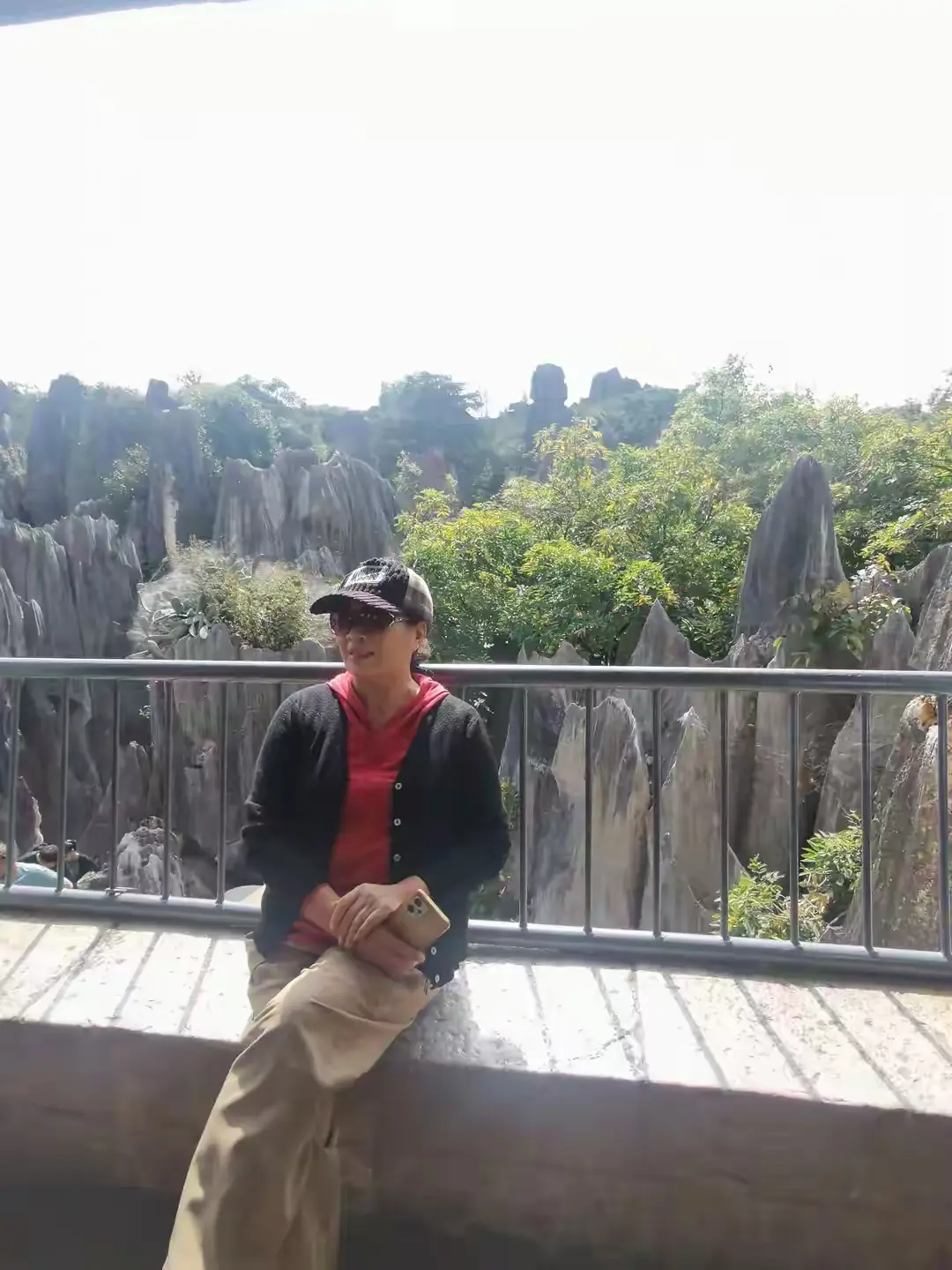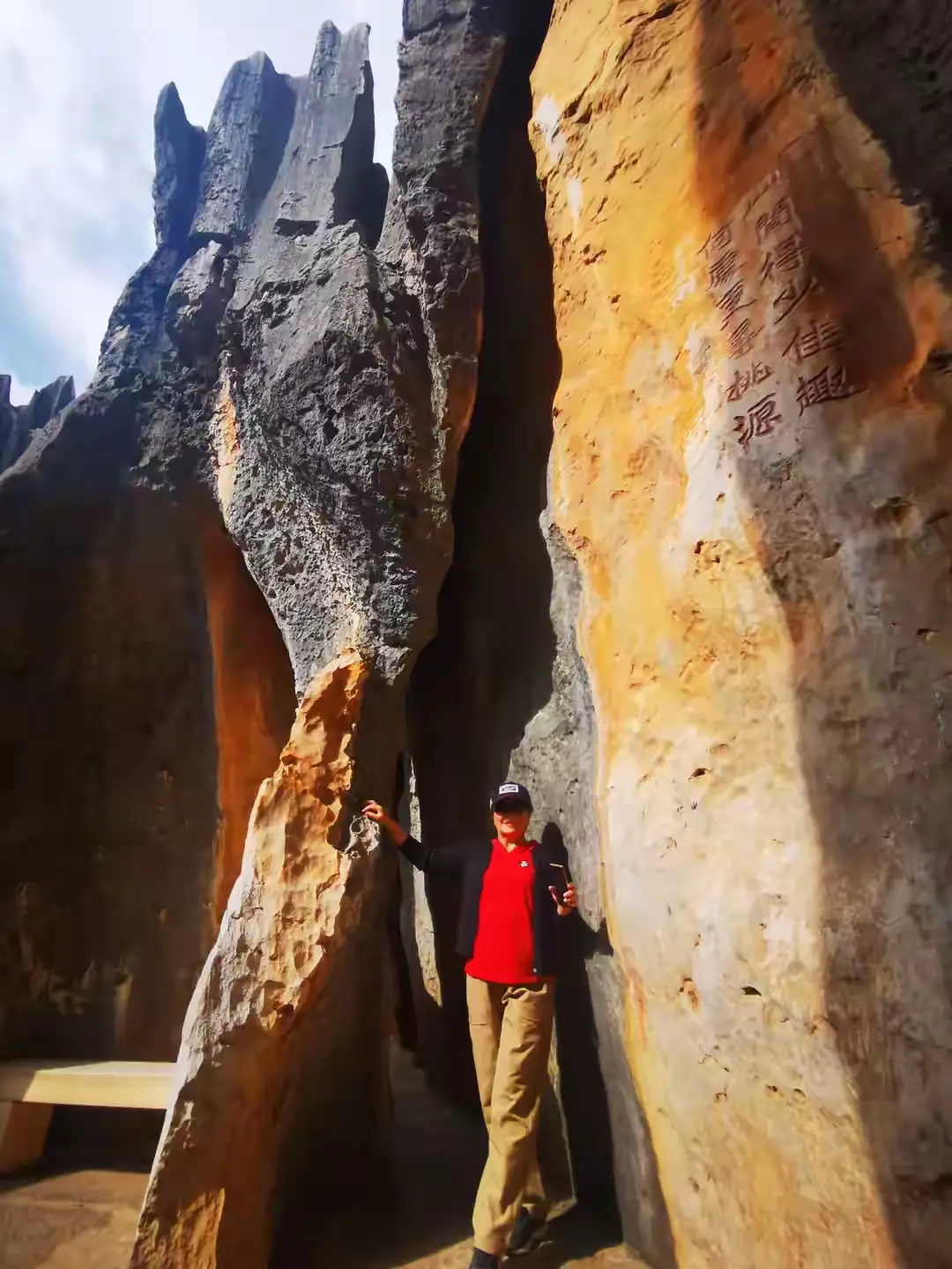 今天是重阳,景区当中到处能见到登高去望远的银发老人,他们三个一群两个一伙,手彼此相携,拄着拐杖,走得迟缓,然而却从容,在一处石阶前方,一位老先生十分小心地搀着老伴,嘴里念叨着慢点,别着急,我们时间有的是,老太太花白的头发在微风里吹拂飘动,脸上呈现出恬静的笑容,他们站定,一起望向那无边无际的石海,目光显得悠远,似乎看的并非当下的风景,而是他们一同走过的、漫长的岁月,这石林的坚硬以及恒久,不正是他们爱情的见证吗 ?如此情境这般情状,相较于那奇特怪异的山峰石头,更能使我内心产生触动。这怎么会是毫无温度的地质公园呢,它分明就是一个洋溢着人间温暖情谊的地方。