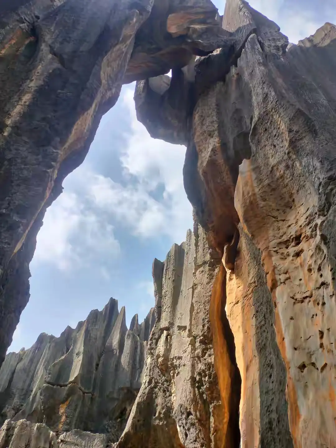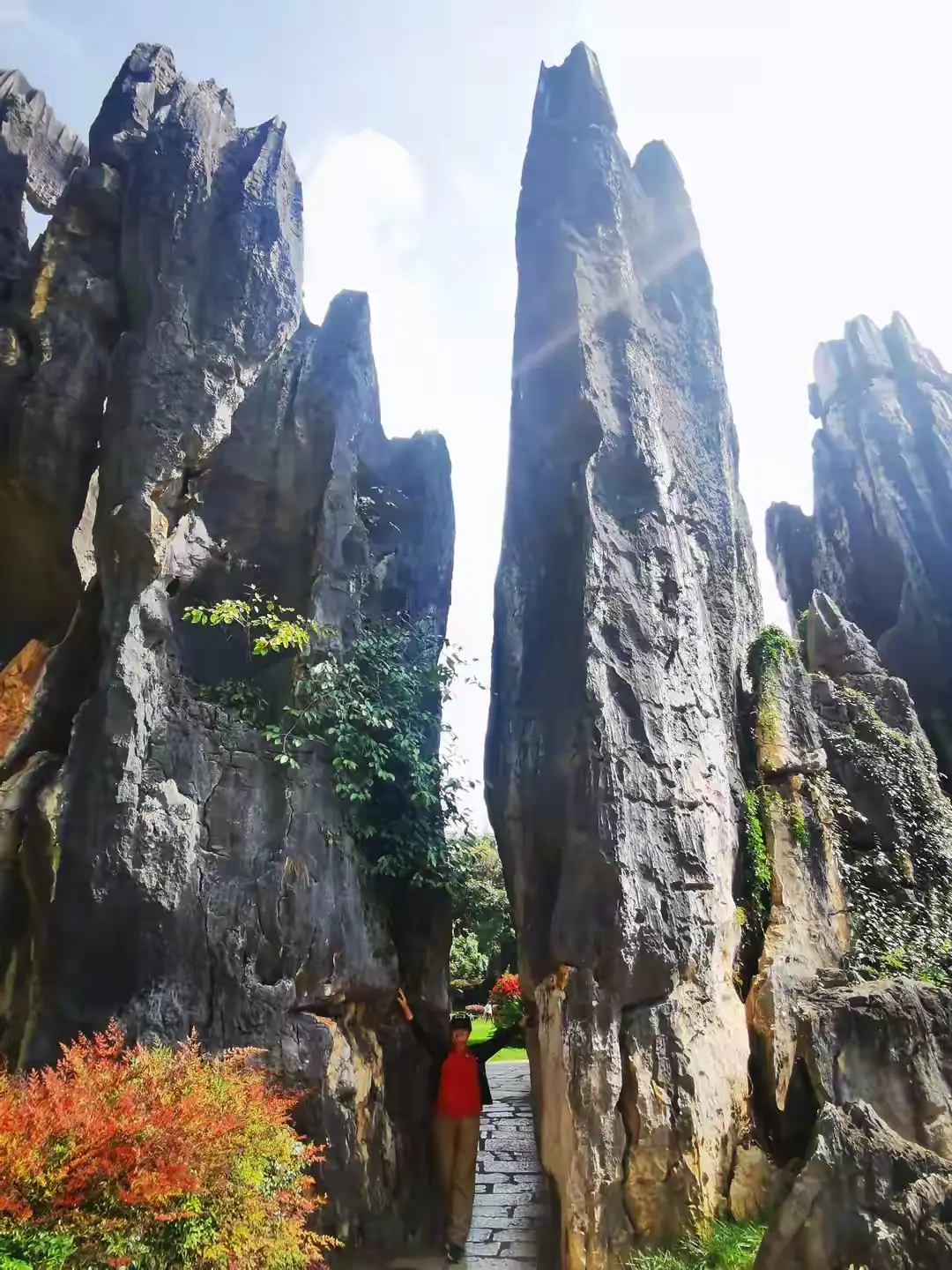 沿途中所见到的,昆明的天空,空旷开阔地呈现着蓝色,就如同一块清透的素瓷那般,均匀地釉上了一层淡白色的云影。阳光呈现出柔金色,完全没有夏日的那股泼辣之气,暖融融地铺洒下来,照着人全身都酥软了。风里携带着草木处于将枯未枯状态的清气,凉丝丝地吹拂过脸颊。恰好遇到重阳佳节,习俗之中有着“重阳登高”这样的缘由,而石林,正是天地之间最为奇崛、最为磅礴的一处“高”地。