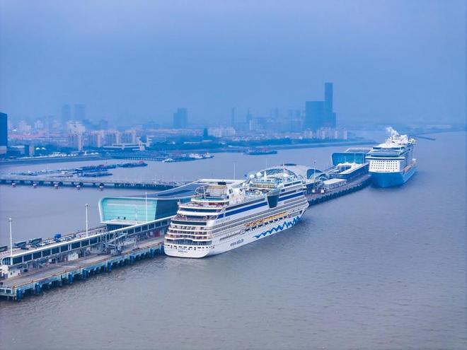 3月16日,“阿依达·星辰号”靠泊,“海洋光谱号”也靠泊,吴淞口国际邮轮港单日入境外籍游客数量创下全国新高,张海峰 摄