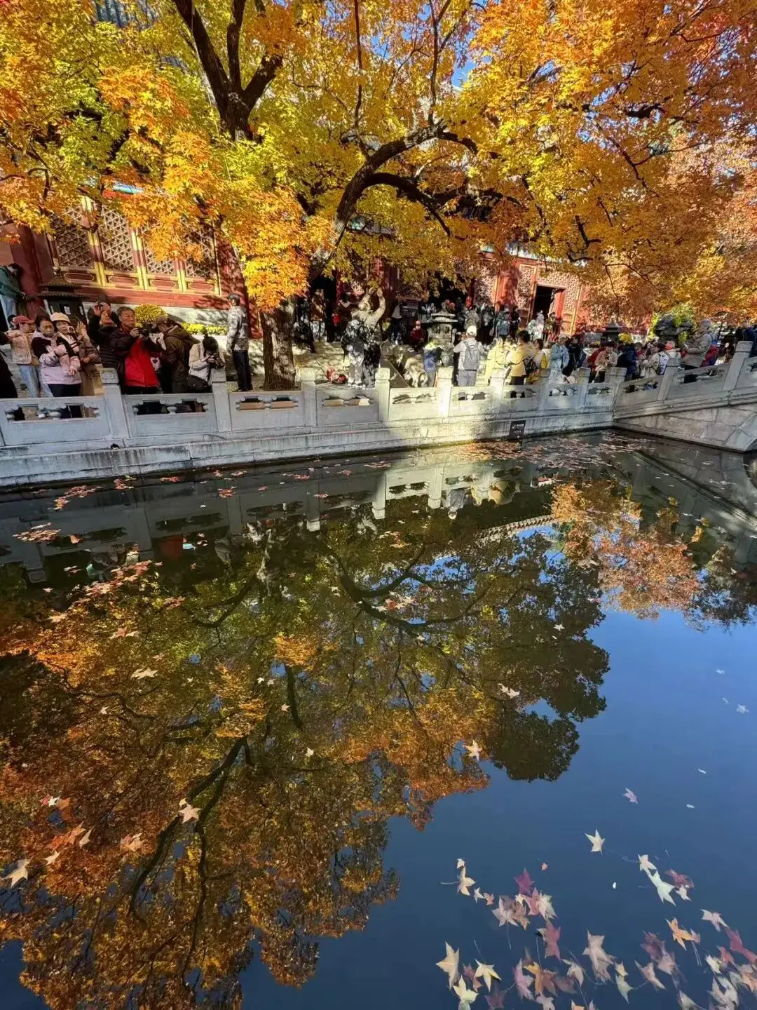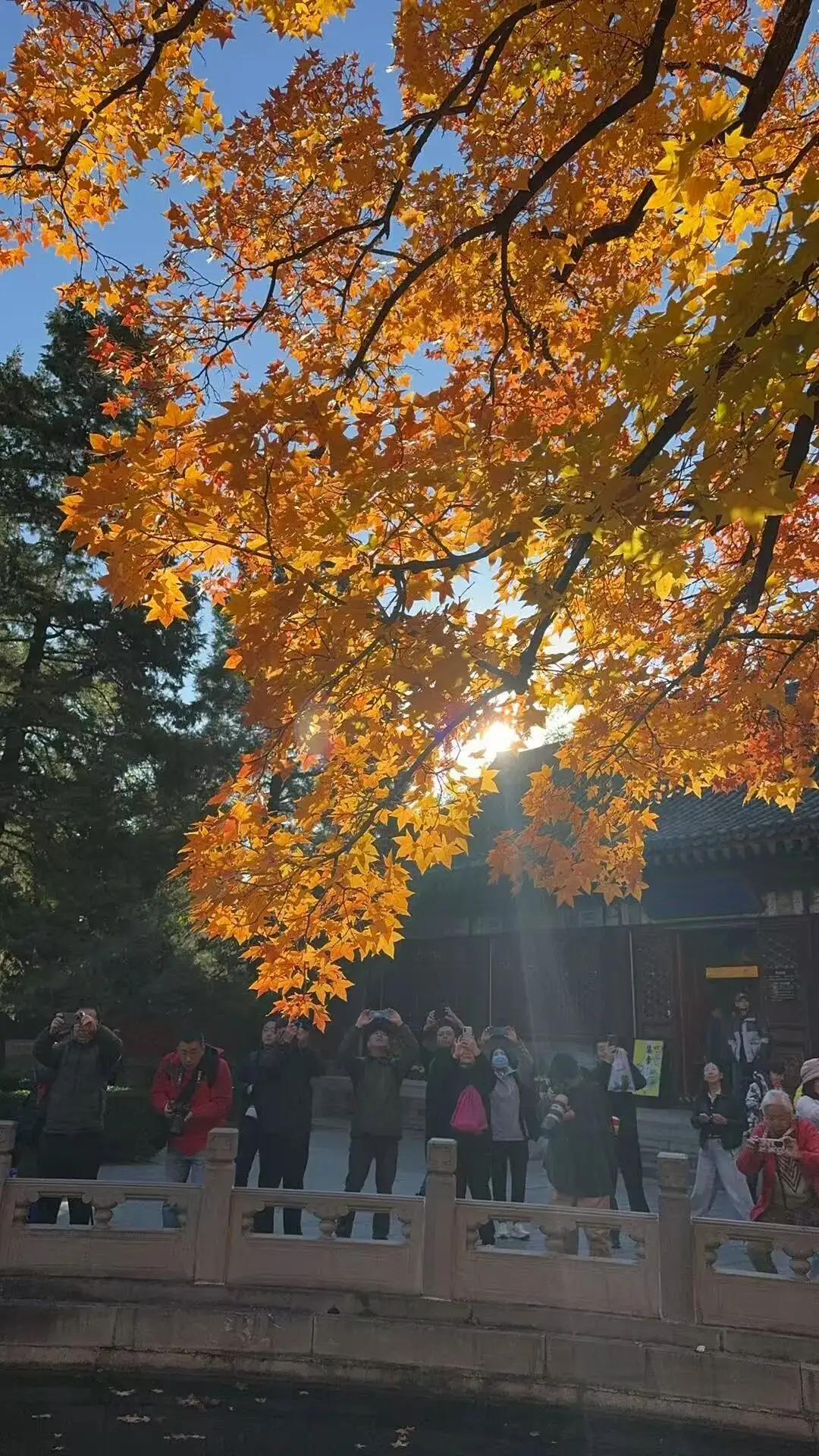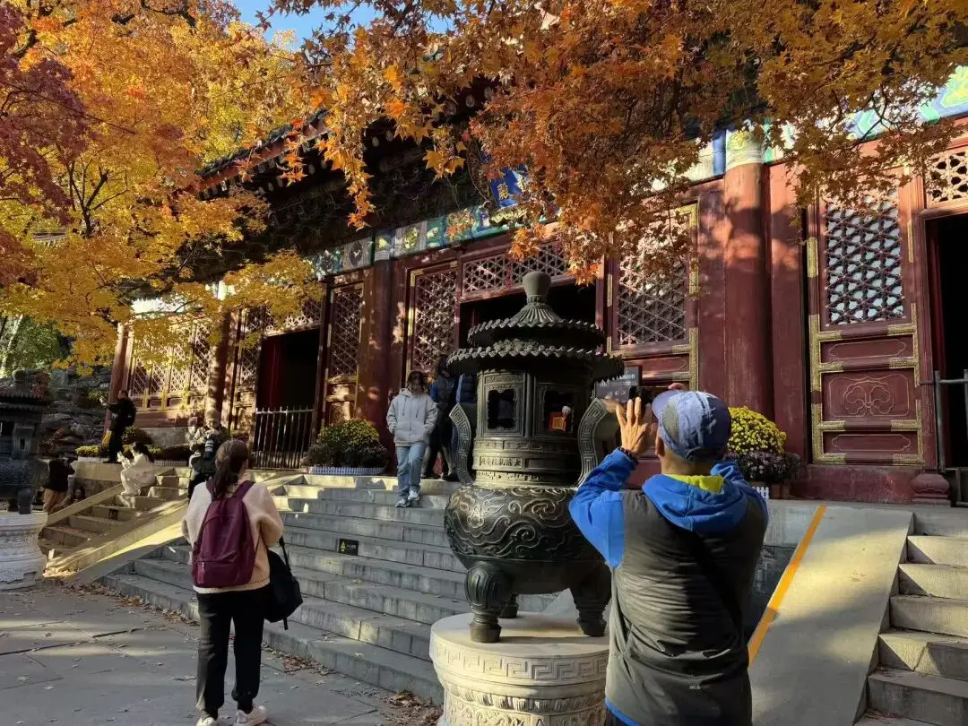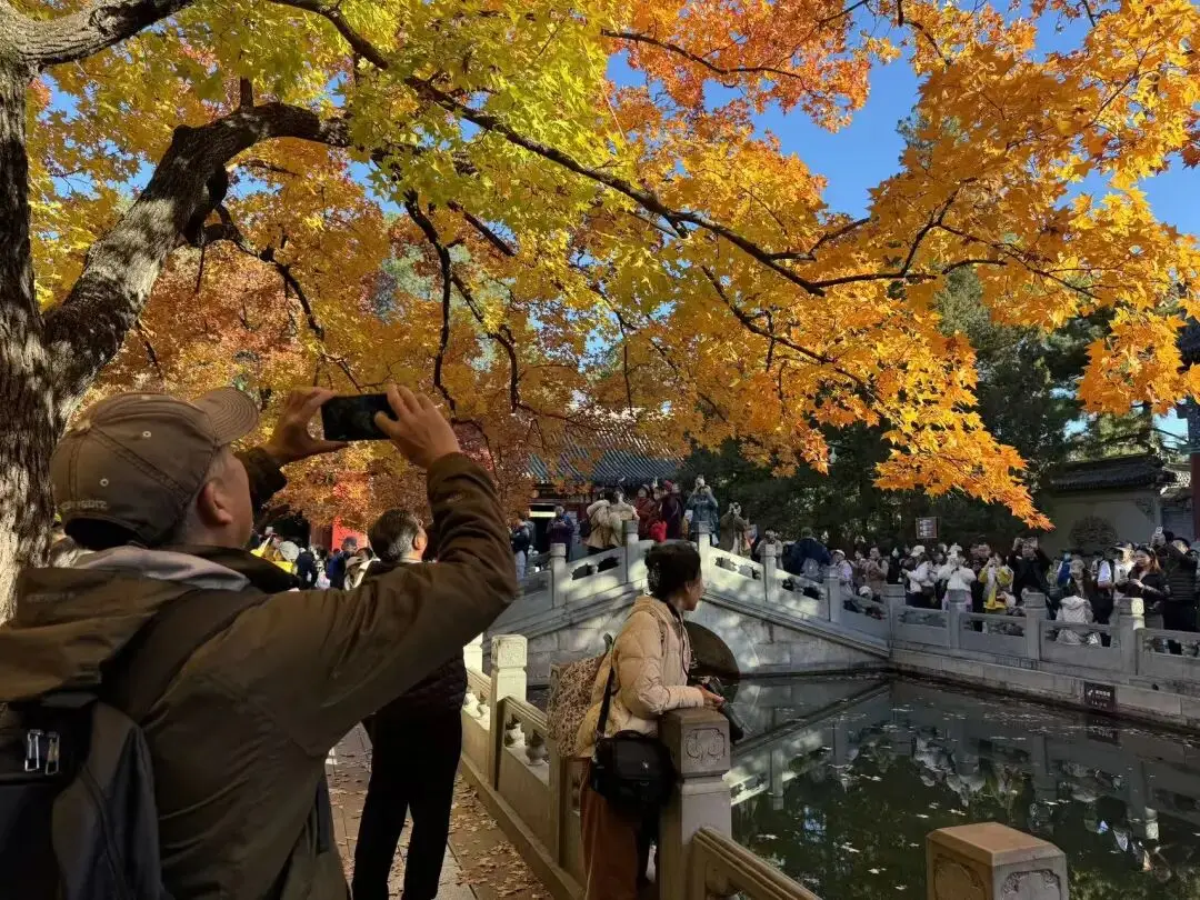 上午,还未到8点,香山公园勤政殿前,有两株元宝枫,迎来了不少游客,这些游客是来赏叶拍照的。这两株元宝枫,颜色从浅绿,变为嫩黄,又变为红色,已呈现出最美的姿态。园内,银杏、黄栌、秋紫白蜡等,众多观赏树种,都已换上多彩的秋装。不少游客,专程从外地赶来,欣赏秋日香山。