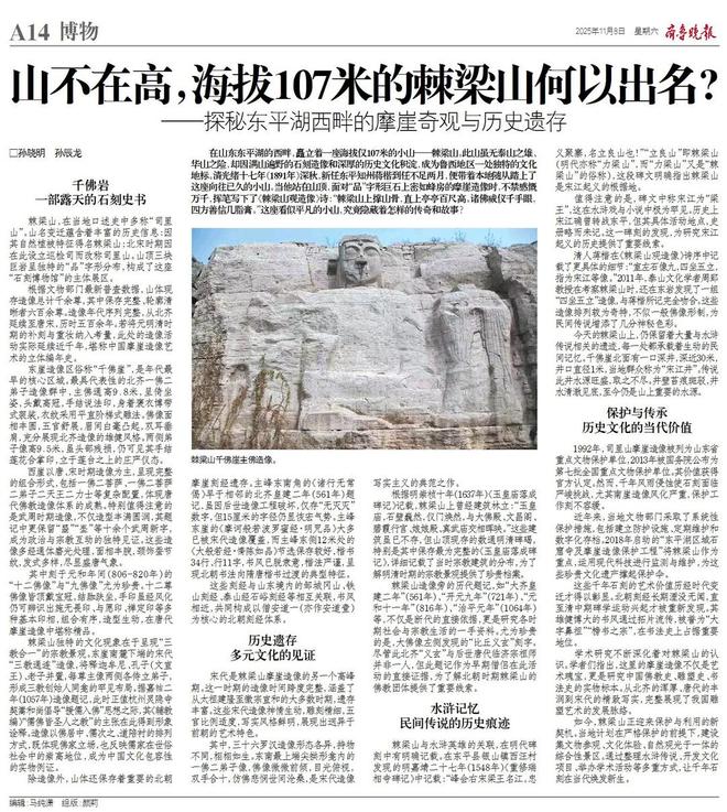 山东东平湖西畔,有一座小山叫棘梁山,它海拔仅107米。此山虽说不像泰山那样雄伟,也不像华山那般险峻,可因满山都是石刻造像,还有深厚的历史文化积淀,就成了鲁西地区一处独特的文化地标。清光绪十七年也就是1891年深秋,新任东平知州蒋楷到任还不满两月,就带着本地随从踏上了这座他一直向往的小山。巅顶之上他伫立,直面“品”状巨石,其上摩崖造像密若蜂房蜂巢,彼时他不禁心潮翻涌感慨无尽,遂提笔写下《棘梁山观造像》诗,诗句为“棘梁山上撑山骨,直上亭亭百尺高 。诸佛威仪千手眼,四方善信几脂膏” ,此座看似平常的小山,究竟暗藏着何种传奇与故事呢 ?