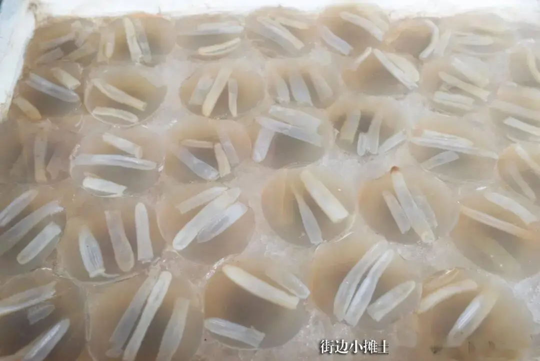 于泉州道路旁边,能够瞧见一个个好似圆滚且呈果冻模样的事物,那仿佛水晶般剔透的“冻”之中,有着好几条如同粗面条般的“装饰物品”,而此等便是当地极为有名的土笋冻了。