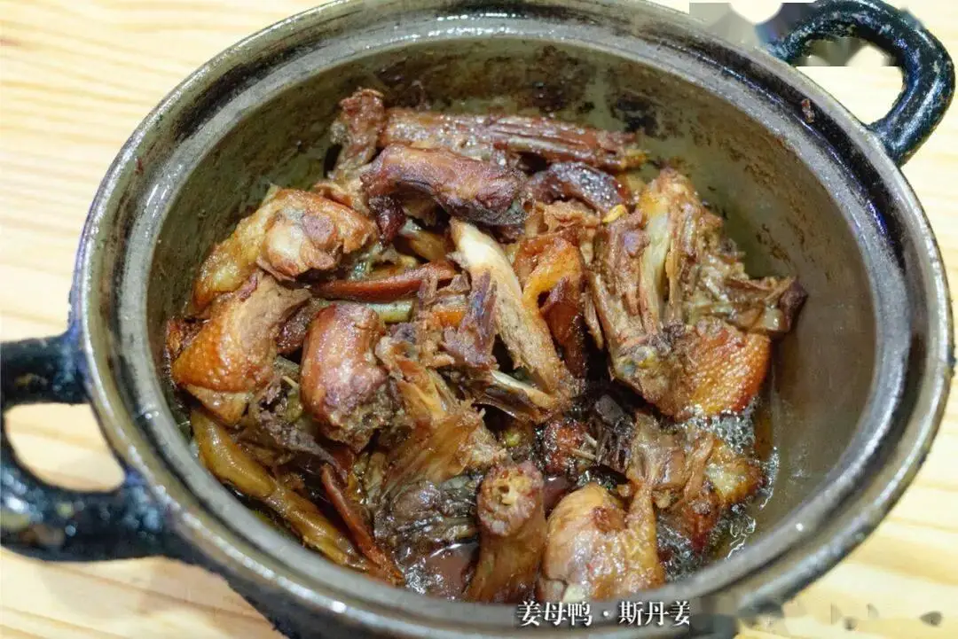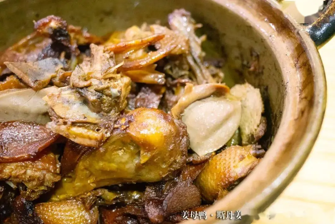 用到泉州斯丹姜母鸭做法,不用一滴水,先把提前煸炒过的姜片铺在锅底,随后将整只鸭子放进砂锅,在砂锅温度慢慢升高时,鸭肉里头的脂肪渐渐融化,一滴一滴落到锅底,并且姜母浓郁霸道的香气逐渐弥漫渗透整只鸭。