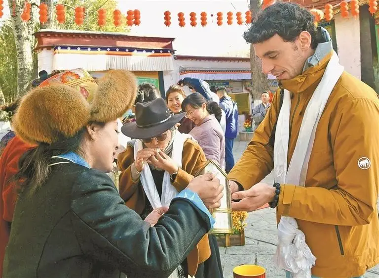 近日,于罗布林卡景区内,中国游客与外国游客一道,共同品尝青稞美酒,感受民俗风情,记者王敏拍摄此情景 。