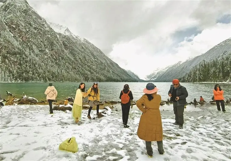 在林芝市工布江达县的那个有着新错湖的湖畔,有游客在雪景当中进行打卡,以此留下纪念,尽情享受着高原上那湖光山色的美好。这是记者次仁平措拍摄的。