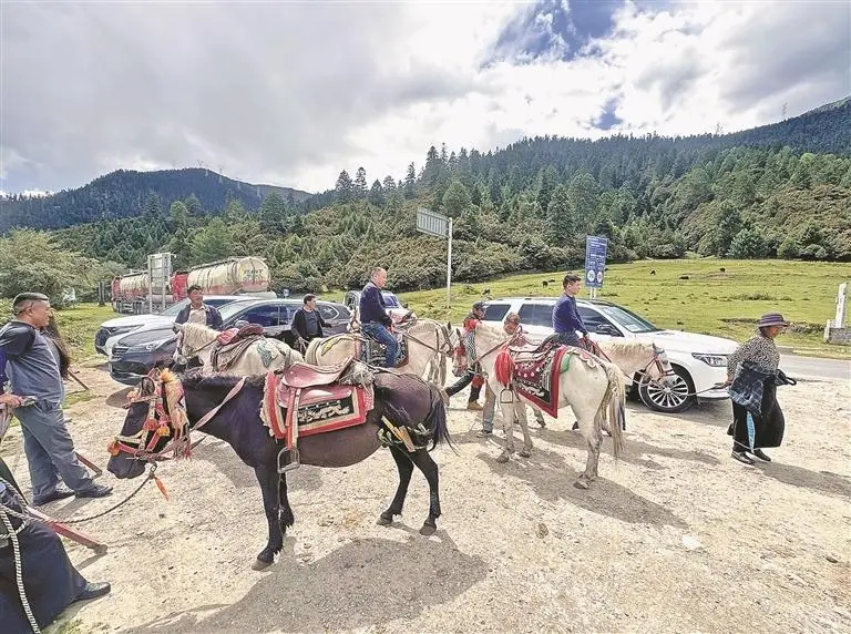 于林芝市鲁朗景区之内,有着游客在体验那当地特色的骑马项目。此场景,由记者白玛泽旺拍摄。