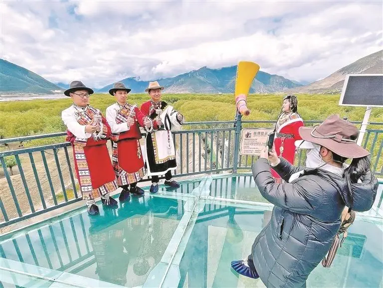 在林芝尼洋河国家湿地公园的旁边,有游客停下脚步,摆好姿势进行合影,以此固定江河那呈现出来的美丽景致 ,拍摄这一画面的是记者次仁平措 。