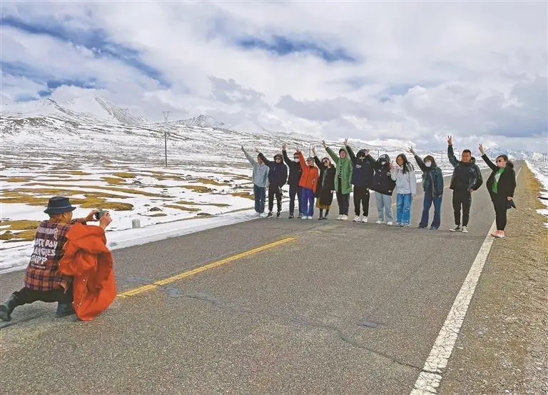 在山南市桑日县的贡德林草原那里,有游客在雪地公路进行合影,以此来记录高原冬日的那种氛围。拍摄者是记者白玛泽旺。 ,。