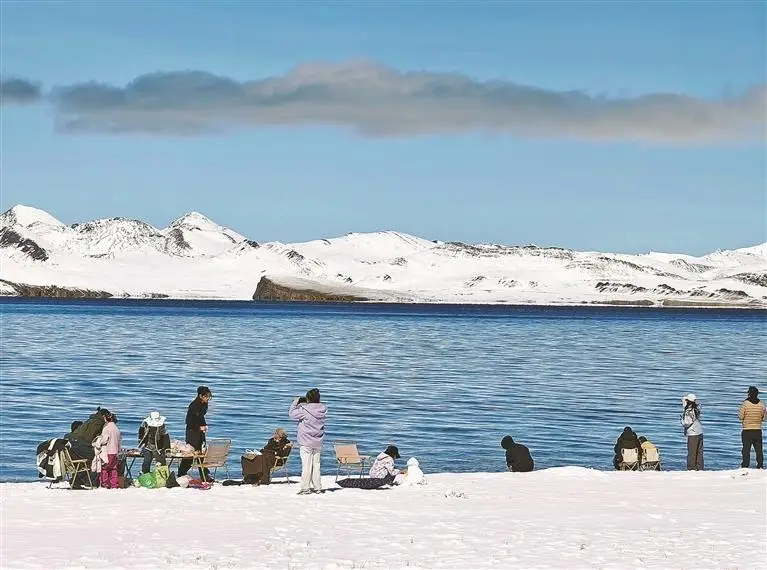 山南市普莫雍错的湖畔那里,有游客在雪域般的湖景当中进行拍照,以此来尽情享受高原冬日呈现出的美景。拍摄者是记者王敏 。