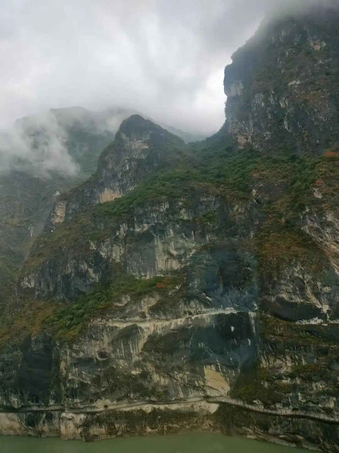 让汹涌的激流猛地撞上巨大的石块进而粉身碎骨,化为数量巨大仿若千堆的雪浪,冲向天空。那发出的轰鸣声并非传入耳朵之中,而是直接撞击着胸膛,就连脚下的岩石都在微微地颤动。细雨、带着寒意的冷风、咆哮着的江水,共同构成一幅具有原始特质且充满野性的画卷。我们这些怀着现代机械乘坐下来的旁观者,在这纯粹的自然伟力面前,除了怀有深深的敬畏,心中再没有其他的杂念。