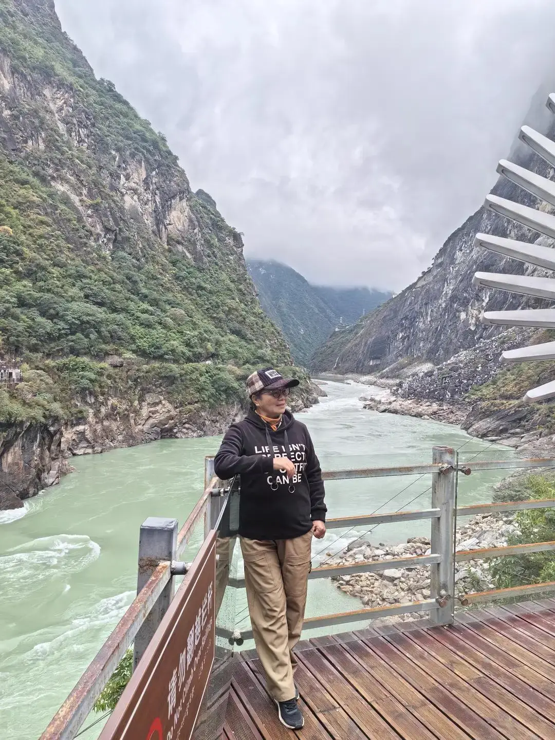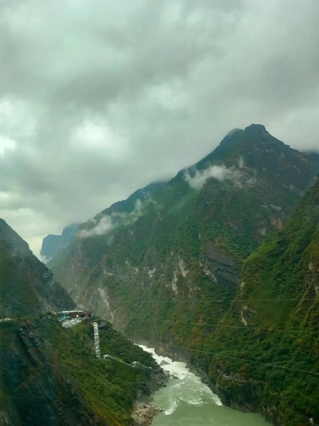那日,在古城逗留了一整天后,我们即刻出发前往风格迥异的豪放之所——虎跳峡。车行驶至灰蒙蒙的山谷之中,山的坡度变得越来越陡。到达之时,天空正飘着如丝般细密的雨点,通向峡谷底部观景处的台阶湿滑溜手,散发着暗暗的光亮。为了保存力气省事些,我跟多数游客一样,购买了电梯票。封闭的轿厢缓慢下降,把葱茏繁茂的山壁以及氤氲迷茫的雨雾挡在窗外,仿若一场借助现代科技把我们送往远古洪荒时期的庄重典礼。