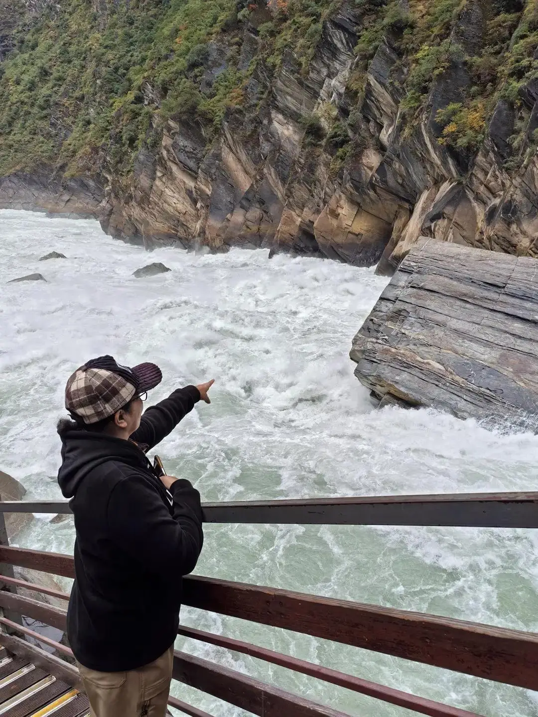刚踏上谷底的观景平台之时,所有人低声传出来的喧哗,刹那间就被金沙江的怒吼给吞没掉了。那并非是我于滇池、洱海以及泸沽湖所看见过的任何水的形态。缓平地带还算温驯的金沙江,流淌到这里时,被两岸的玉龙、哈巴雪山突然收束起来,挤入仅有三十米宽的豁口之中,好似一条被完全激怒的黄色巨龙,带着雷霆万钧的力量,咆哮着,翻滚着,以崩山裂石的气势砸向江心那块稳稳不动的虎跳石。