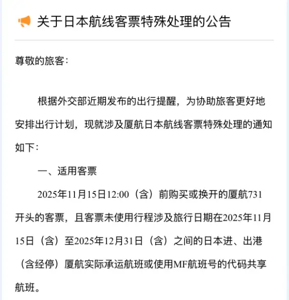 南航于通知里明确指出,对于在今年11月15日12:00(含该时刻)之前购买或者换开的,南航784开头的客票,而且客票未使用行程涉及旅行日期处于2025年11月15日(含此日期)至2025年12月31日(含此日期)之间的,日本进、出港(包含经停)的南航实际承运航班或者使用CZ航班号的代码共享航班,航班起飞前取消已确定好座位的旅客,在客票有效期之内申请退票,免收退票费。首次变更至相同航程的南航实际承运航班,免收变更费,要是发生票价价差则按规定收取。
