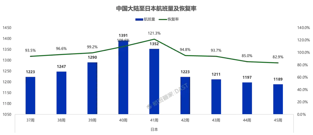 民航换季以及市场因素有所影响,中国大陆到日本的周度航班量大幅下滑了,按照航班管家数据来看,第45周也就是11.03 - 11.09这周,航班量是1189班次,恢复率是跟2019年同期相比的,为82.9%,并且环比第40周下降了14.5%。