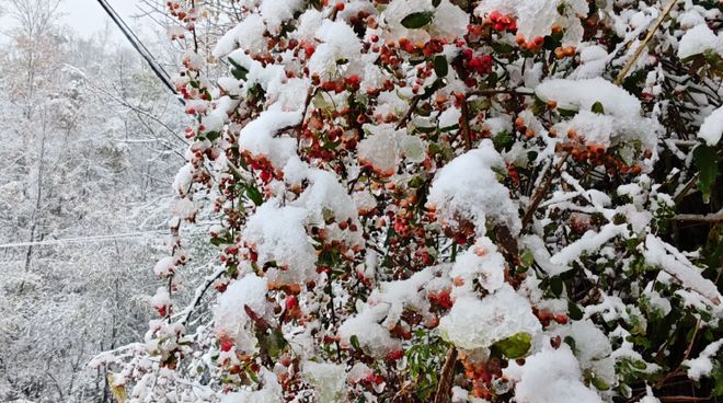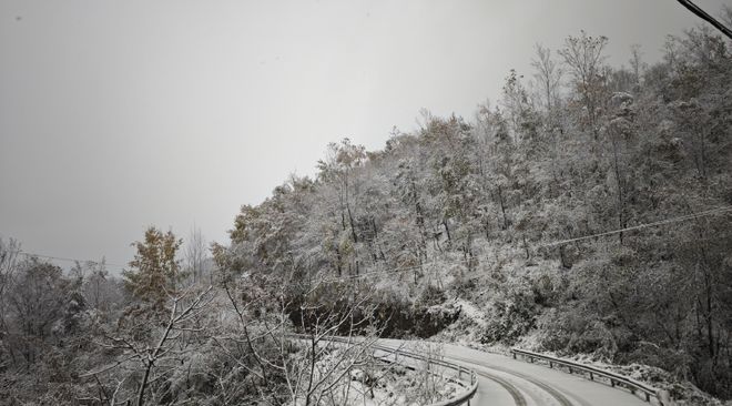 因强冷空气持续朝着南方下降影响,在11月17日,重庆云阳县境内,海拔比较高的上坝、农坝、大阳、桑坪、清水等乡镇,纷纷飘下了今冬第一场雪花。在同一时间,群山头部变白,万树长出琼枝,高海拔地区安静地换上了素净又皎洁的银装。