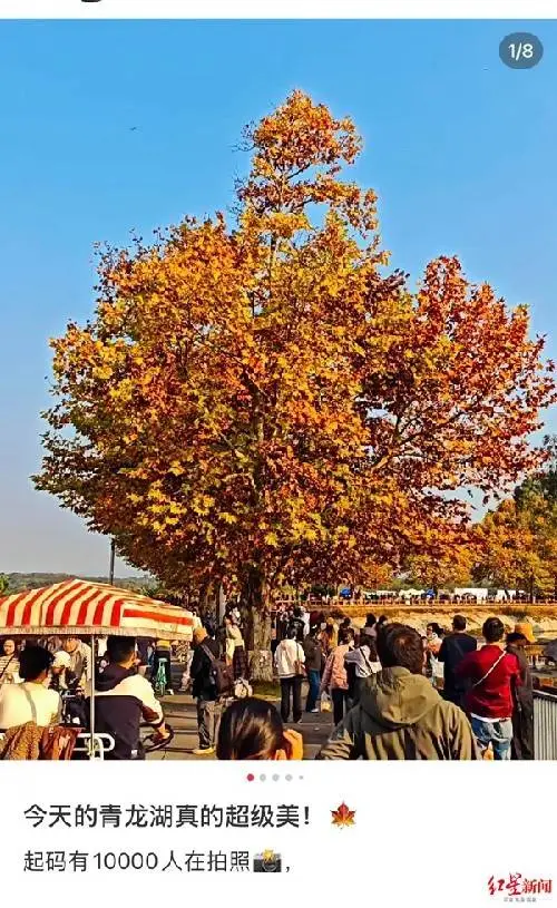 “真的啦,青龙湖那地儿美到超乎想象,起码得有一万号人在那儿咔嚓咔嚓拍照呢”,“梧桐树营造出的氛围感简直绝了”,“最近时间段的青龙湖热闹得不行不行的,梧桐树下到处都是人”……在大伙于网络上发布的游玩攻略、拍摄攻略里头,阳光照耀下梧桐叶散发着金色光芒,树影摇曳情况下挤满了正在拍照的人群 。