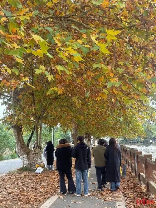十一月十七日,红星新闻有记者前往青龙湖的“梧桐小道”。路旁存在着数十棵梧桐树,树上的叶子已然泛黄,地面之上也是布满了黄色的落叶,氛围的感觉十分充足,小道上面站立着十几个人,众人分作三五成群的状态,于梧桐树下拍摄冬日的大片 。