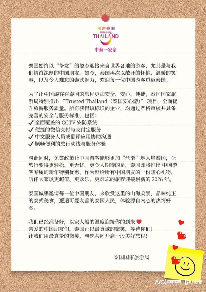 推文中有所透露,即泰国不久后将会推出一项专属于中国游客的新年特别优惠,这优惠被当作献给每一位中国朋友的一份能让人心生温暖的礼物,为了陪伴大家以有着更高性价比、更多欢乐感受、更令人难忘体验的旅程去迎接全新的2026年。
