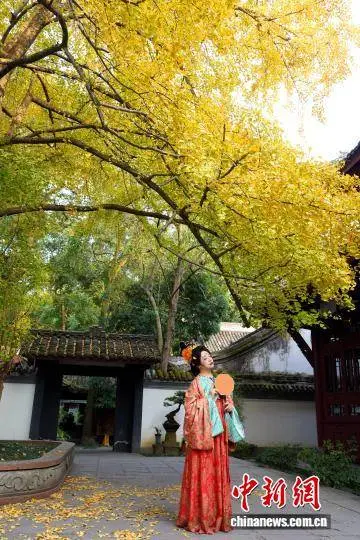 农历十一月二十三日,于四川成都之地,有游客身着古装以在成都杜甫草堂博物馆之内的银杏树下进行拍照留念之举。立冬过后,成都便逐渐地步入了银杏的观赏季节范围,于大街小巷、公园校园之处,那一片片的金黄之色,给这座城市增添了无穷无尽的浪漫以及诗意。中新社记者安源所拍摄 。