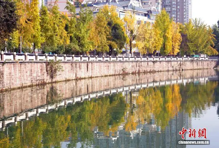 在11月23日,于四川成都,有成都市百花潭公园外河边银杏树的倒影,立冬过后,成都就逐渐步入了银杏的观赏季,在大街小巷、公园校园,那一抹抹金黄,给这座城市增添了无尽的浪漫与诗意。中新社记者安源摄。