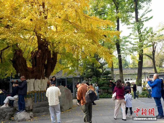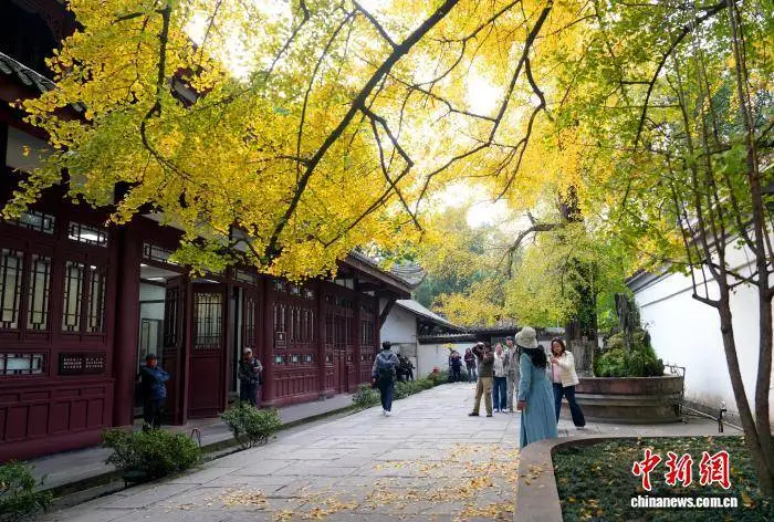 11月23日,四川成都,游客在成都杜甫草堂博物馆内的银杏树下拍照留念。立冬过后,成都便渐渐步入了银杏的观赏季,大街小巷、公园校园,那一抹抹金黄,为这座城市增添了无尽的浪漫与诗意。中新社记者 安源 摄