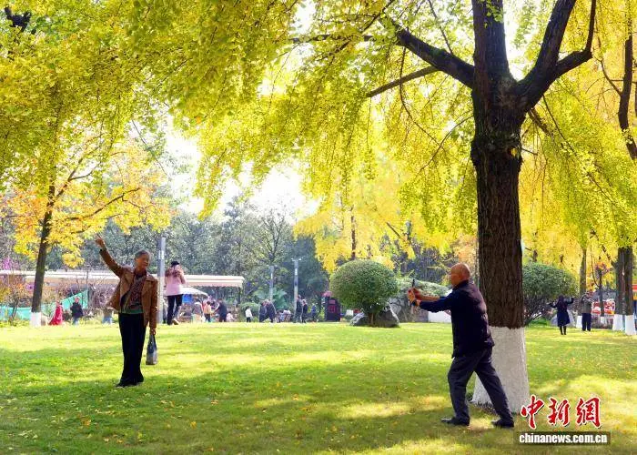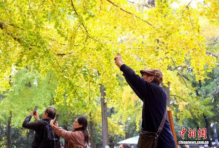 11月23日,四川成都,市民在成都市百花潭公园内的银杏树下拍照留念。立冬过后,成都便渐渐步入了银杏的观赏季,大街小巷、公园校园,那一抹抹金黄,为这座城市增添了无尽的浪漫与诗意。中新社记者 安源 摄
