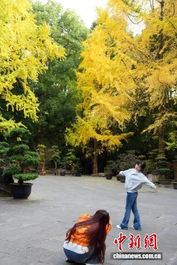 11月23日,在四川成都,有这样一群游客,他们于成都杜甫草堂博物馆内,在银杏树下,进行拍照留念的行为。立冬过后,成都便渐渐步入那么一个阶段,是银杏的观赏季。在大街小巷,在公园校园,那呈现出的一抹抹金黄,为这座城市增添了无尽的浪漫与诗意。此乃中新社记者安源所拍摄的照片 。