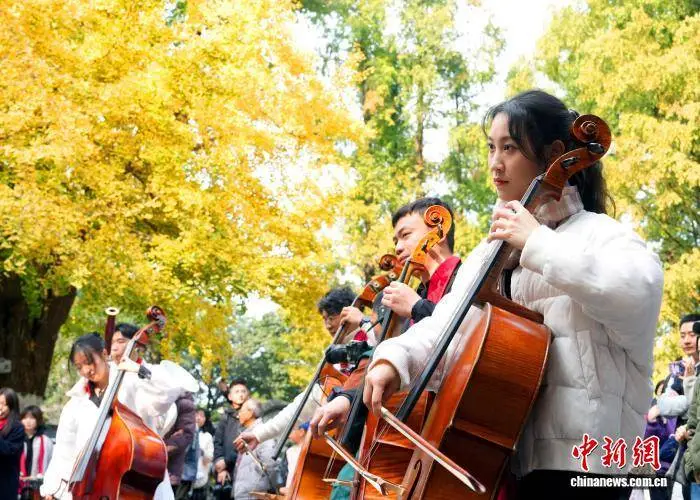 11月23日,地点是四川成都,成都交响乐团的演员于成都市百花潭公园内进行演奏,立冬过后,成都便逐渐步入了银杏的观赏季,大街小巷、公园校园,那一行行金黄,为这座城市增添了无尽的浪漫跟诗意,中新社记者安源摄。